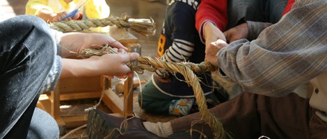 地域の名人たちと作るお正月飾りの「しめ縄」。二人一組でお互い協力してできた「手作りしめ縄」で気持ちよく新年が迎えられます。